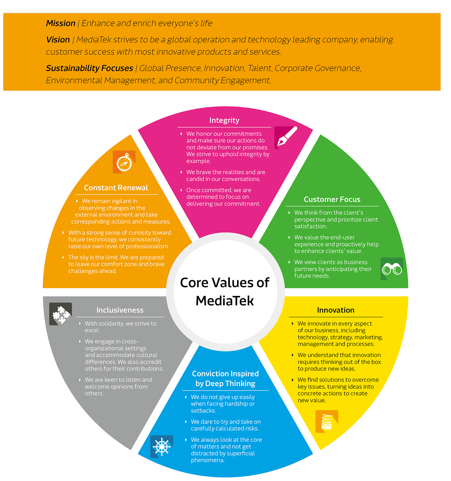 MediaTeks sustainability development framework is built on six pillars: Global Presence, Innovation,