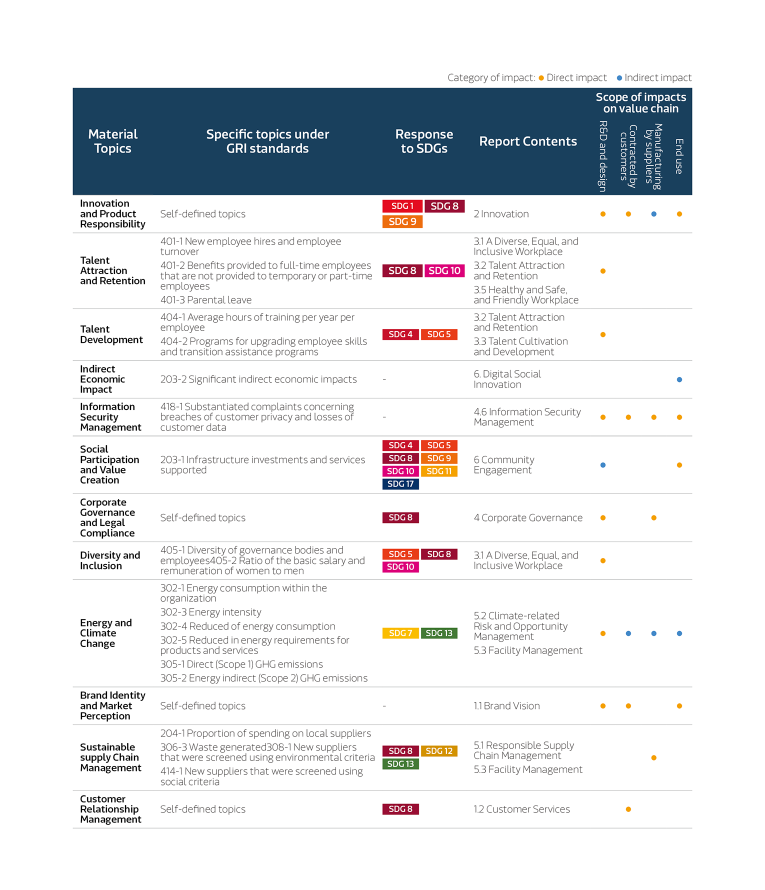 After material issues are finalized, each working group of the Sustainability Committee would evaluate the impact of 11 major issues on the economy, environment and people/human rights, including positive/negative impact and actual/potential likelihood. Impact is then ranked based on the results of evaluation, while the responding measures, short-, mid- and long-term goals, annual results and management guidelines are presented in the report, in accordance with the requirements of GRI 3-3 Management of material topics.