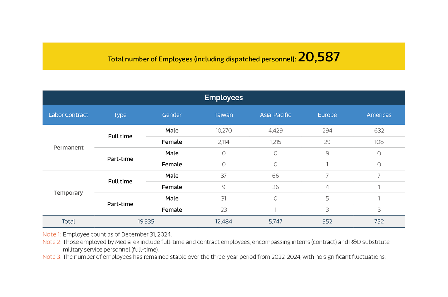 At MediaTek, our core strength lies in R&D, innovation and global operation, and we recognize the significance of talents in driving sustainable growth and innovation. As of the end of 2024, MediaTek had 19,335 employees across 32 business locations worldwide, with overseas employees accounting for approximately 35.4% of the total number. Through interaction and collaboration of our diverse talents, we unleash employees potential, spark their innovation, and enhance the Company's competitiveness. We are committed to creating an inclusive workplace where every employee feels respected and valued, thereby increasing employees job satisfaction and their sense of belonging.